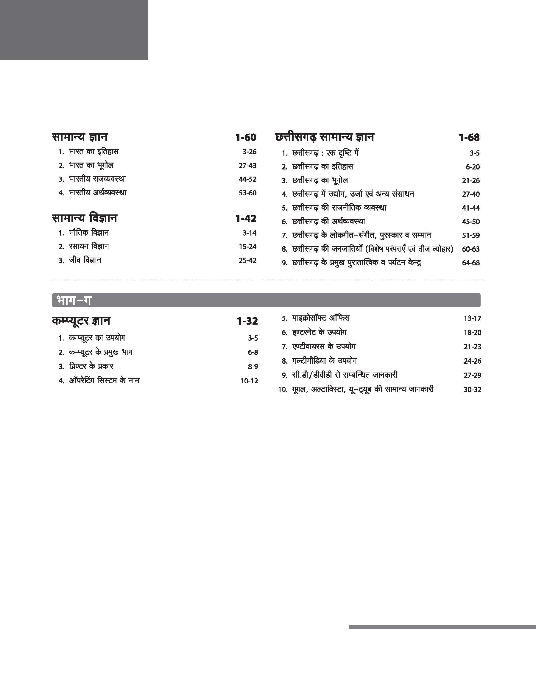 - Complete coverage of Hindi, English, Mathematics, Mental Ability, General Knowledge, Chhattisgarh GK, and Computer Knowledge