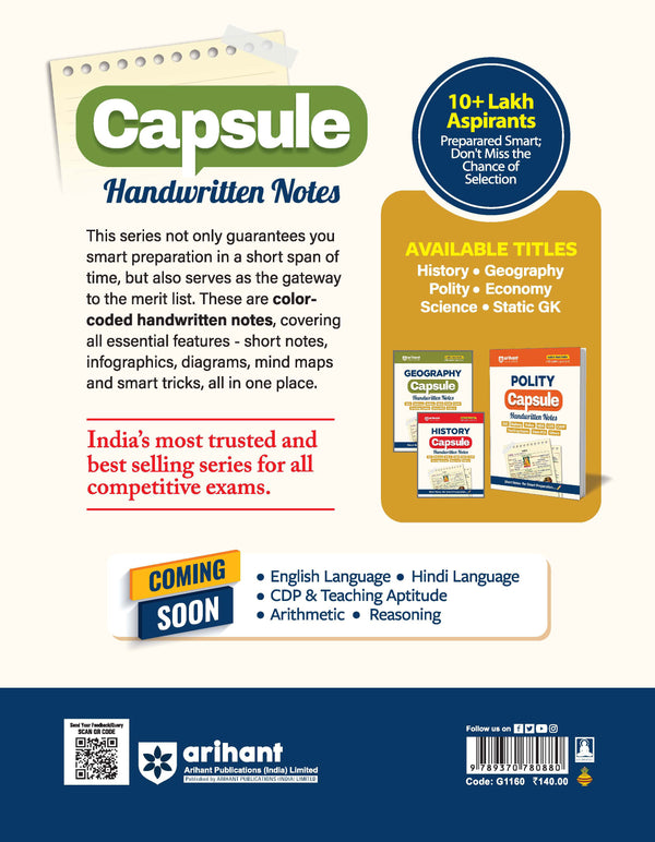 The Arihant Geography Capsule – Handwritten Notes is a bestselling quick-preparation guide for aspirants of competitive exams such as SSC, Railway, Police, NDA, CDS, CAPF, IB, Teaching Exams, State PCS, and other state-level tests. With its concise handwritten-style presentation, this capsule provides short, exam-focused notes that cover the complete Geography syllabus.